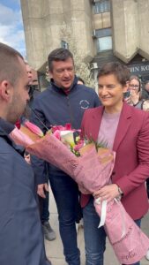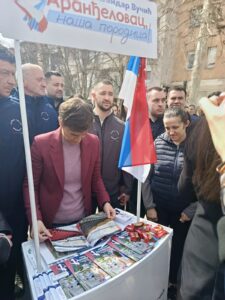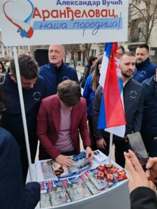 Председница Народне скупштине Ана Брнабић посетила је штанд Српске напредне странке на Тргу слободе у Аранђеловцу, где је разговарала са активистима и грађанима и пружила јасну подршку страначким активностима. Са скупа је послата јасна порука слоге и победе из Аранђеловца.