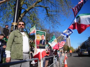 Испред иранске амбасаде, група “Позорница за слободу“ окупила се поред транспарента на којем је писало: “Хвала вам председниче Доналде Трампе. Хвала вам, премијеру Бењамине Нетањаху“, преноси GB њуз.